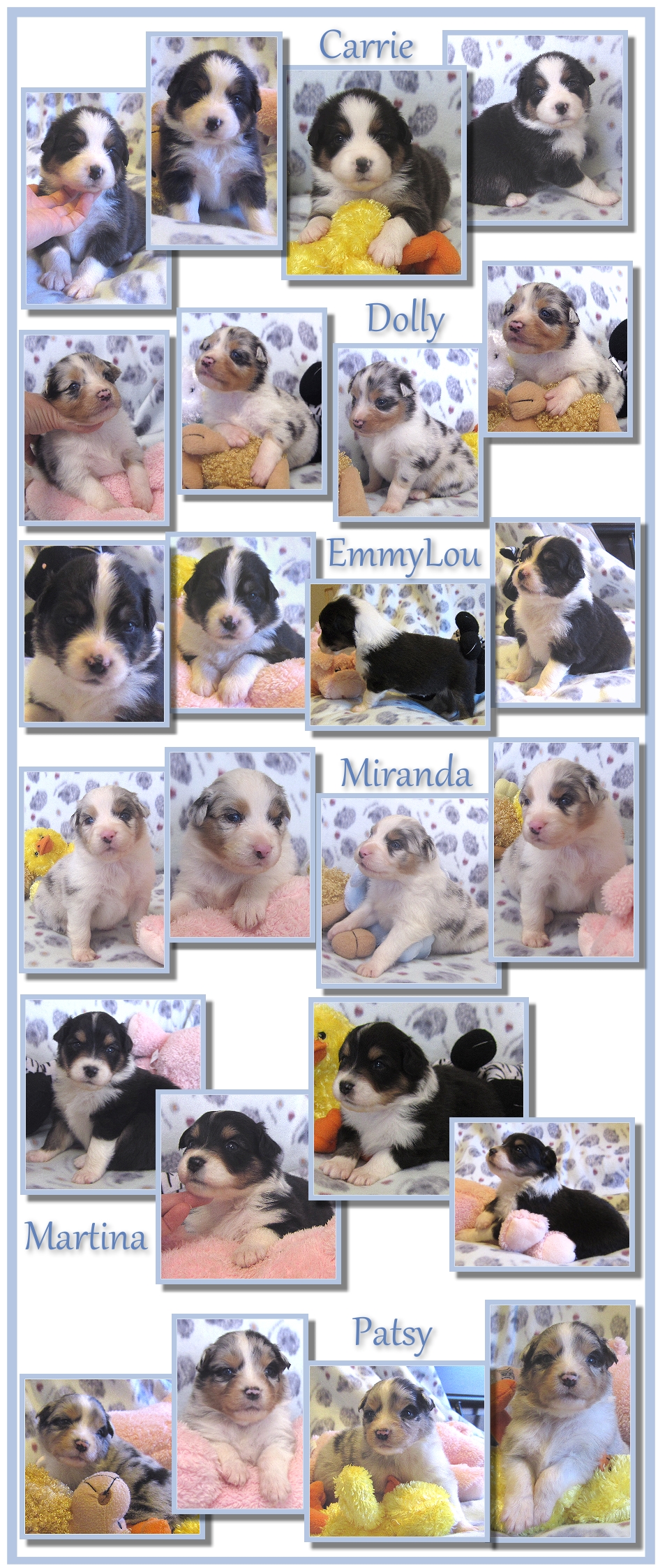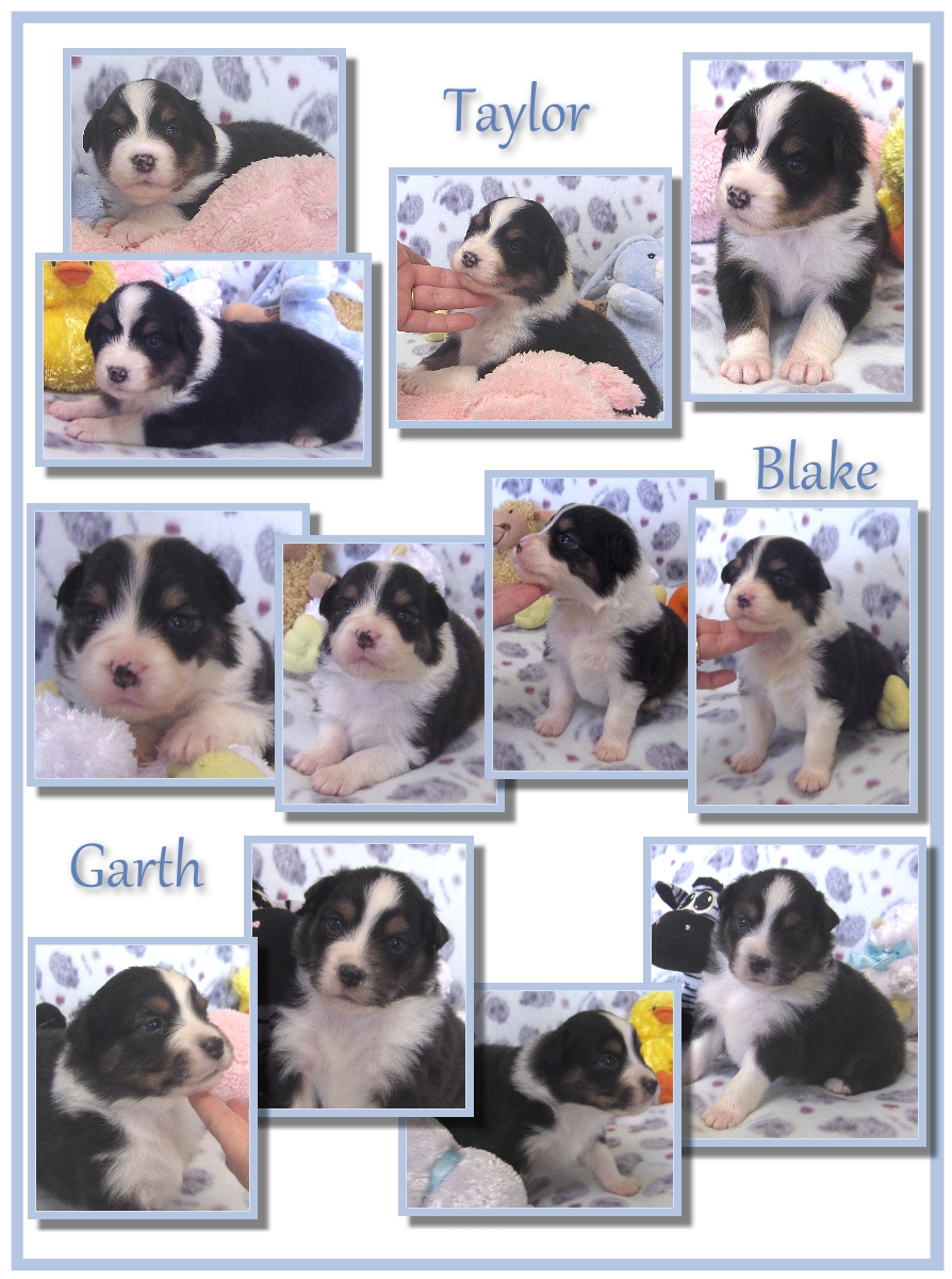 We have 4 black tri females, 3 blue merle females and 2 black tri males.